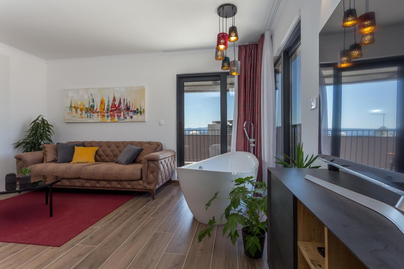 One-Bedroom Apartment. The hot tub and sauna are the special features of this apartment. Boasting a private entrance, this air-conditioned apartment comes with 1 living room, 1 separate bedroom and 1 bathroom with a walk-in shower and a bath. In the kitchen, guests will find a stovetop, a refrigerator, a dishwasher and kitchenware. Featuring a terrace with sea views, this apartment also features a washing machine and a flat-screen TV with streaming services. The unit has 2 beds.