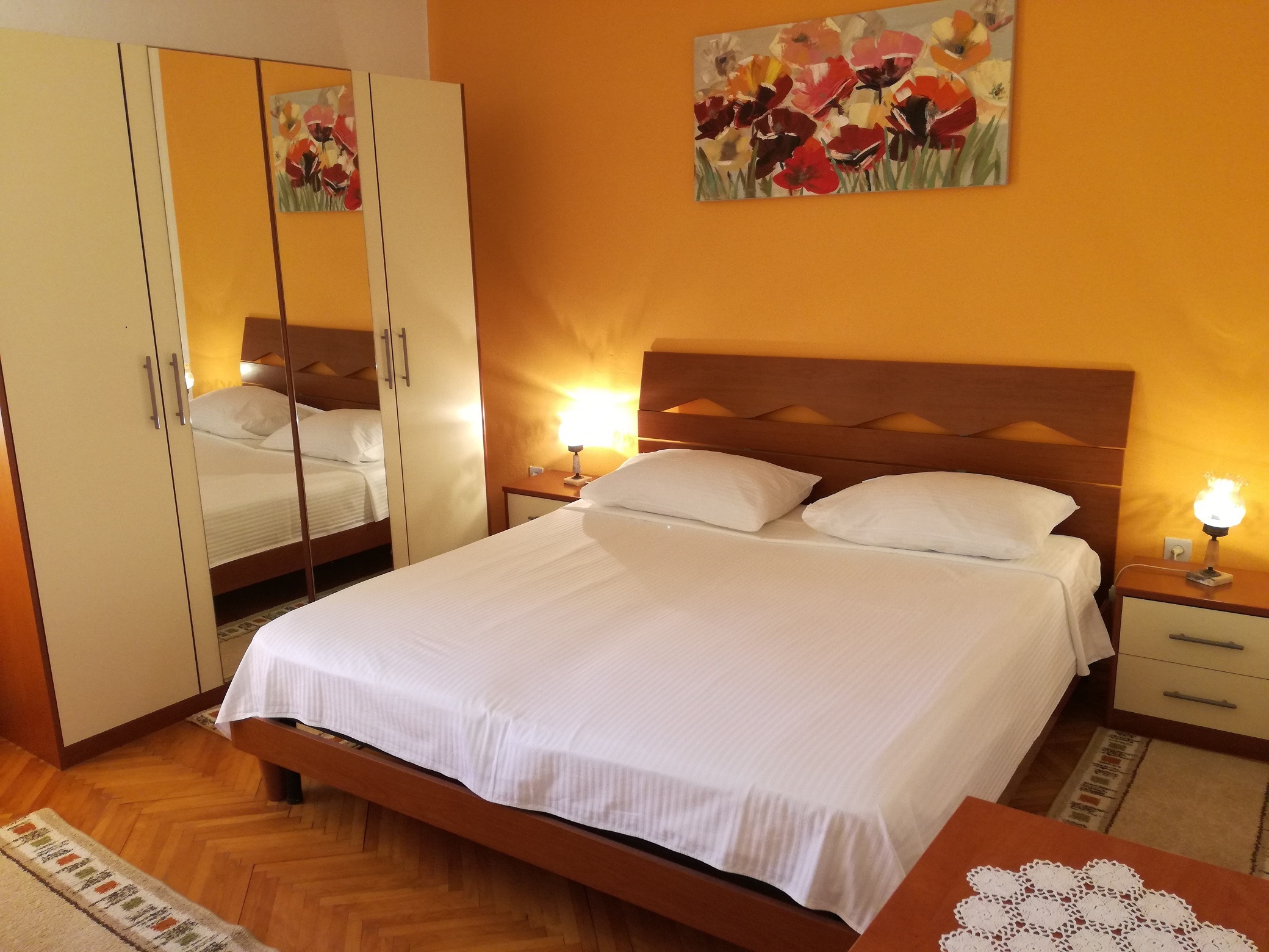 Apartment can accommodate 7 guests. Beds are situated in 3 sleeping rooms, within 96m2. Guests can use a private terrace to enjoy the warm summer evenings. Food can be prepared using barbecue which is shared with other guests too. This accommodation unit welcomes pets at an additional charge. INCLUDED IN THE PRICE: tourist tax, final cleaning, air-conditioning, parking, internet, baby cot, iron, ironing board, hairdryer. OBLIGATORY ADDITIONAL COSTS: short stay fee (surcharge depending on a number of booked nights: 30% - 1, 20% - 2, 10% - 3). OPTIONAL ADDITIONAL COSTS: boat mooring (€10.00 per night), pets (€5.00 per night). The availability of additional services for your chosen dates of stay, as well as their prices (if none are listed) must be checked ahead of time. Any additional services not shown in the price calculation are payable directly to the property owner and only if used by the visitor.