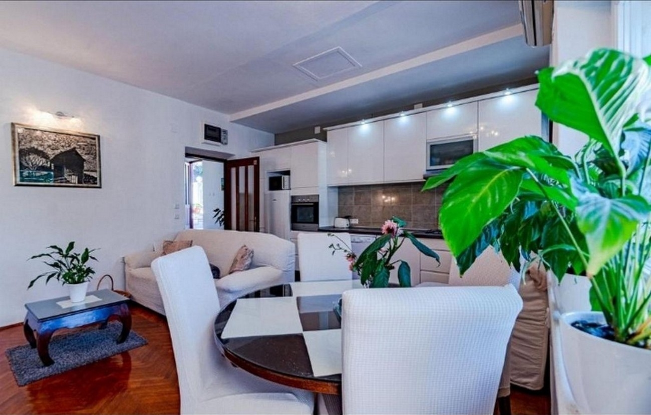 Apartment can accommodate 3 guests. Beds are situated in 1 sleeping rooms, but also in the living room, within 61m2. Guests can use a private terrace to enjoy the warm summer evenings. The apartment offers the sea view. Food can be prepared using barbecue which is shared with other guests too. INCLUDED IN THE PRICE: tourist tax, final cleaning, air-conditioning, parking, internet, baby cot, iron, ironing board, hairdryer, 1 bed for children (included in the price). OBLIGATORY ADDITIONAL COSTS: short stay fee (surcharge depending on a number of booked nights: 30% - 1, 20% - 2, 10% - 3). The availability of additional services for your chosen dates of stay, as well as their prices (if none are listed) must be checked ahead of time. Any additional services not shown in the price calculation are payable directly to the property owner and only if used by the visitor.