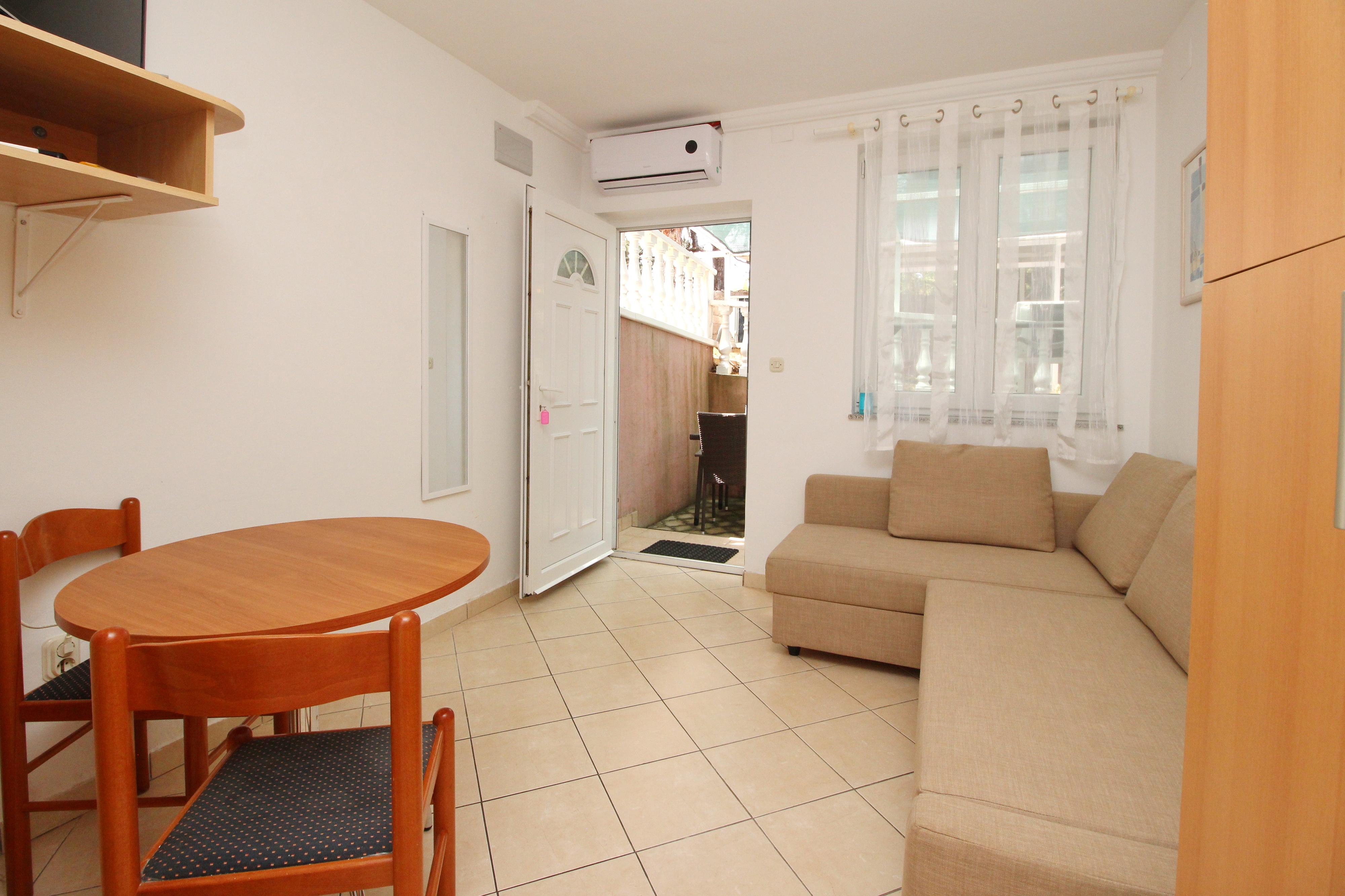Studio flat can accommodate 2 guests. Beds are situated in living room, within 21m2. Guests can use a private terrace to enjoy the warm summer evenings. This accommodation unit welcomes pets at an additional charge. INCLUDED IN THE PRICE: tourist tax, final cleaning, air-conditioning, parking, internet. OBLIGATORY ADDITIONAL COSTS: short stay fee (surcharge depending on a number of booked nights: 30% - 1, 20% - 2, 10% - 3). OPTIONAL ADDITIONAL COSTS: pets (€10.00 per night). The availability of additional services for your chosen dates of stay, as well as their prices (if none are listed) must be checked ahead of time. Any additional services not shown in the price calculation are payable directly to the property owner and only if used by the visitor.