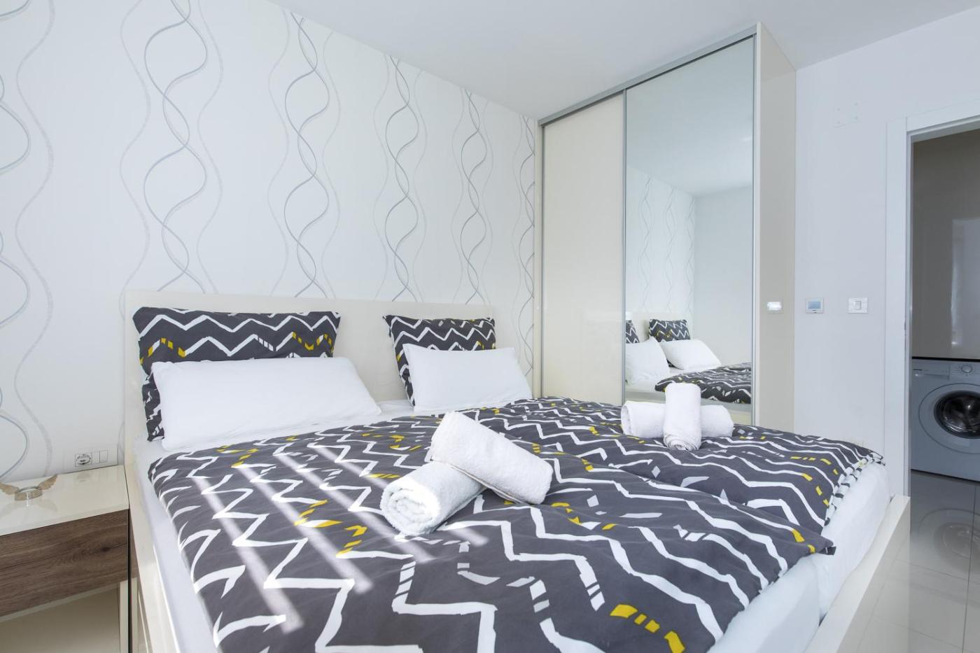One-Bedroom Apartment. Boasting a private entrance, this air-conditioned apartment includes 1 living room, 1 separate bedroom and 1 bathroom with a shower. Guests will find a refrigerator, a dishwasher, an oven and a toaster in the kitchen. The apartment also features a barbecue. This apartment has a washing machine, a coffee machine, a flat-screen TV with satellite channels and a terrace. The unit has 3 beds.