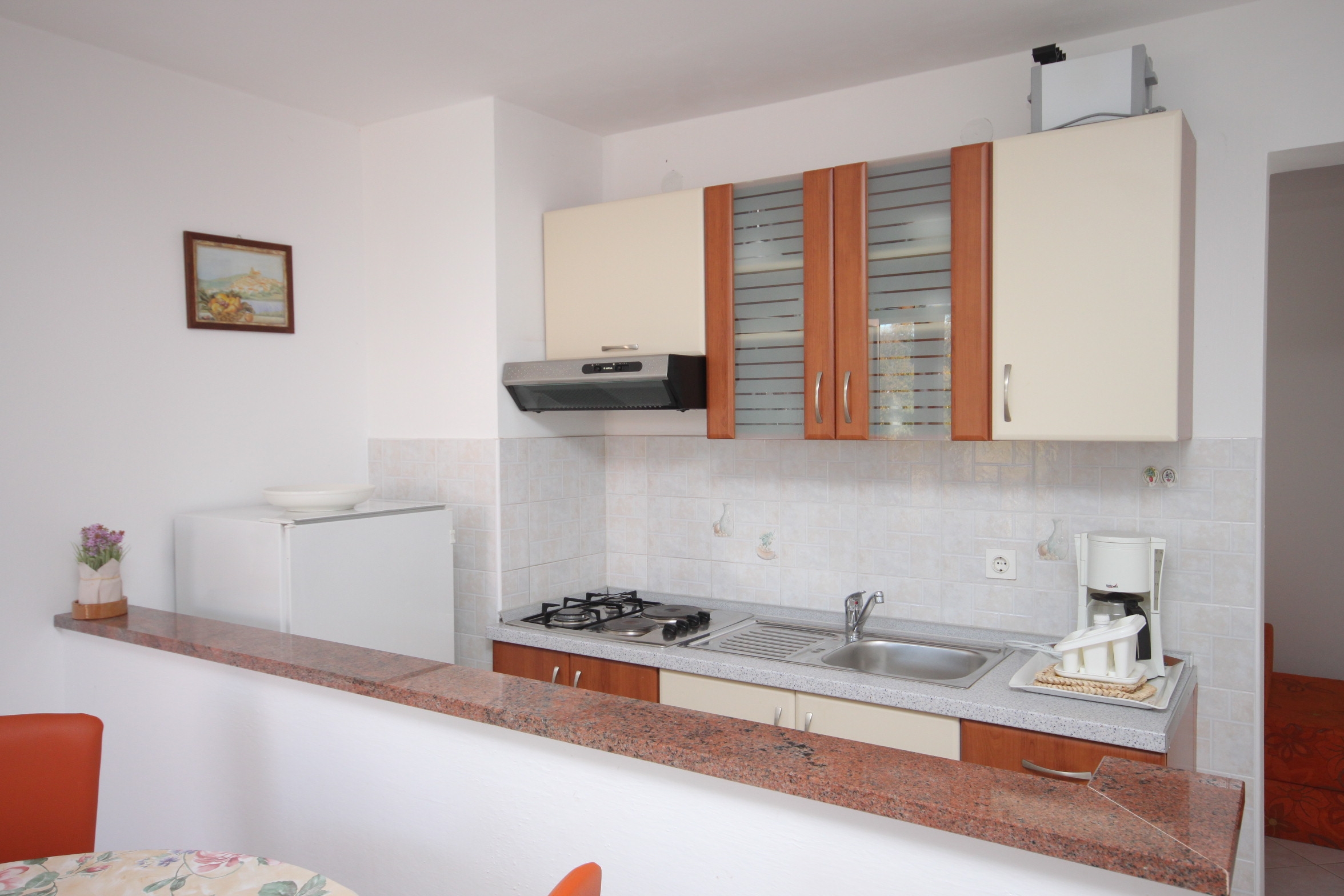 Apartment can accommodate 3 guests. Beds are situated in 1 sleeping rooms, but also in the dining room, within 37m2. Guests can use a private terrace to enjoy the warm summer evenings. The apartment offers the sea view. Food can be prepared using barbecue which is shared with other guests too. INCLUDED IN THE PRICE: tourist tax, final cleaning, air-conditioning, parking, internet, iron, ironing board, hairdryer. OBLIGATORY ADDITIONAL COSTS: short stay fee (surcharge depending on a number of booked nights: 30% - 1, 20% - 2, 10% - 3). OPTIONAL ADDITIONAL COSTS: additional bed (€5.00 per night). The availability of additional services for your chosen dates of stay, as well as their prices (if none are listed) must be checked ahead of time. Any additional services not shown in the price calculation are payable directly to the property owner and only if used by the visitor.