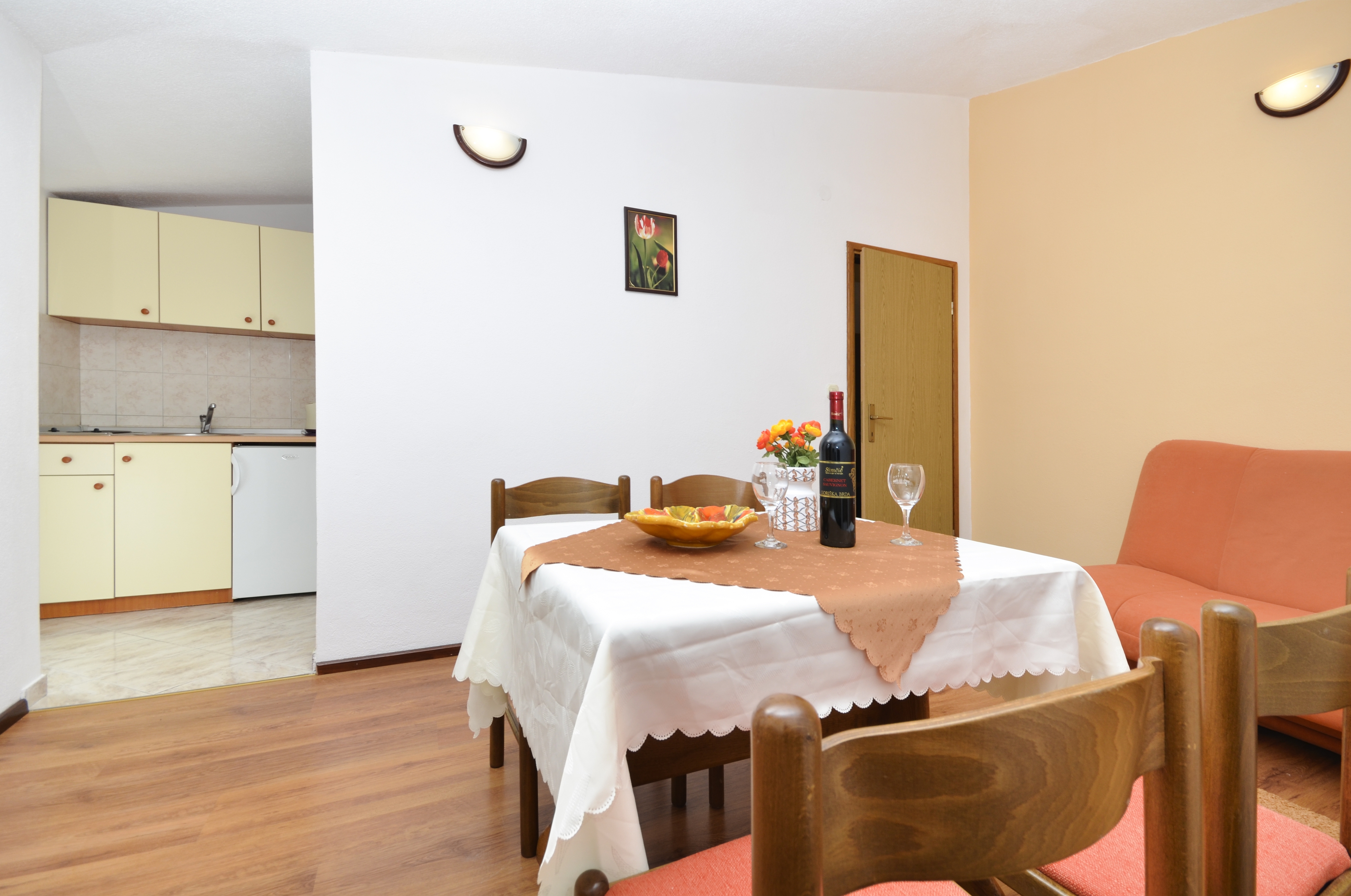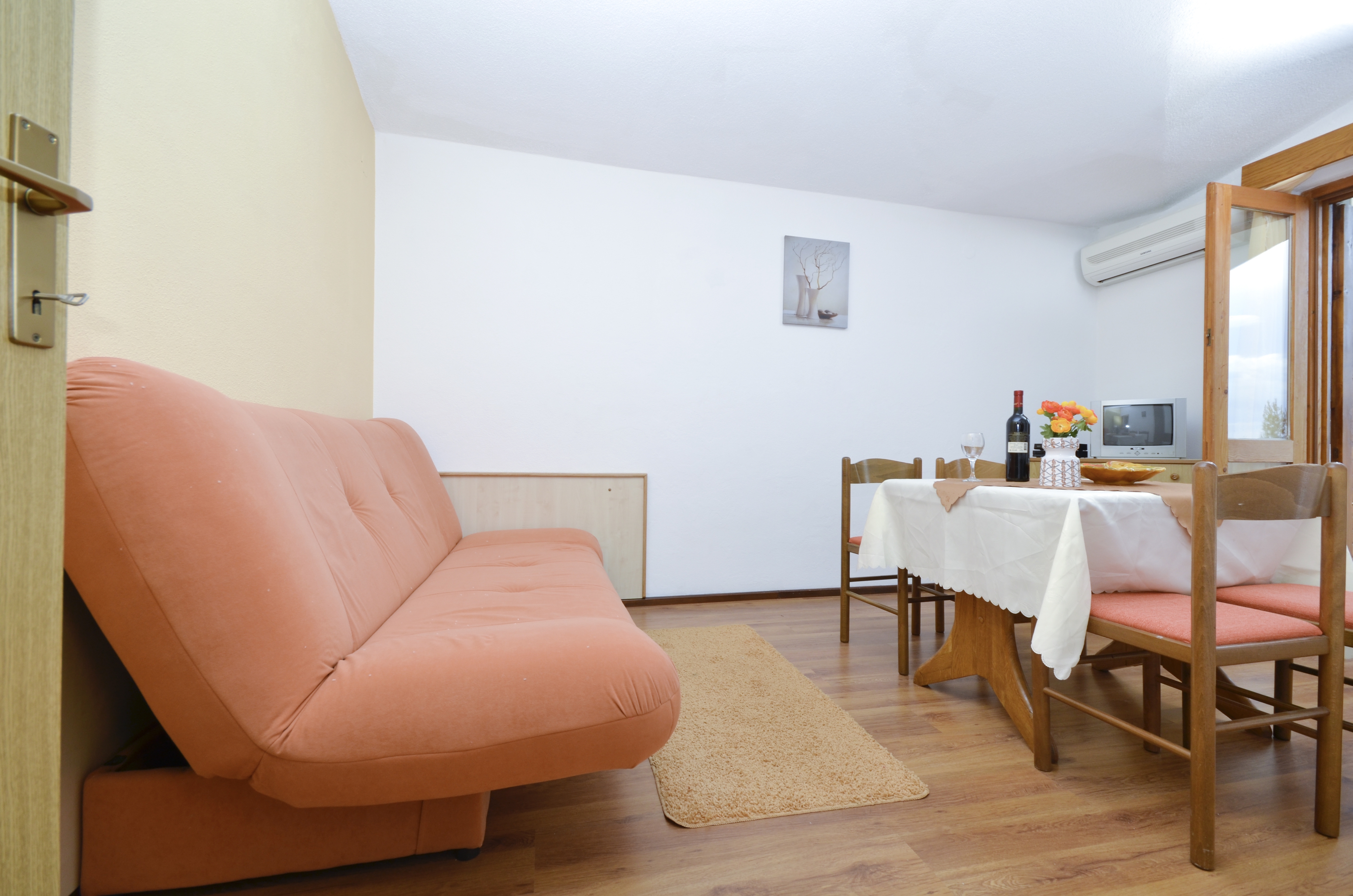Apartment can accommodate 4 guests. Beds are situated in 1 sleeping rooms, but also in the dining room, within 30m2. Guests can use a private balcony to enjoy the warm summer evenings. Food can be prepared using barbecue which is shared with other guests too. Shared pool is on disposal during stay. INCLUDED IN THE PRICE: tourist tax, final cleaning, air-conditioning, pool, parking, internet, baby cot, iron, ironing board, hairdryer. OPTIONAL ADDITIONAL COSTS: laundry (€3.00 washing). The availability of additional services for your chosen dates of stay, as well as their prices (if none are listed) must be checked ahead of time. Any additional services not shown in the price calculation are payable directly to the property owner and only if used by the visitor.