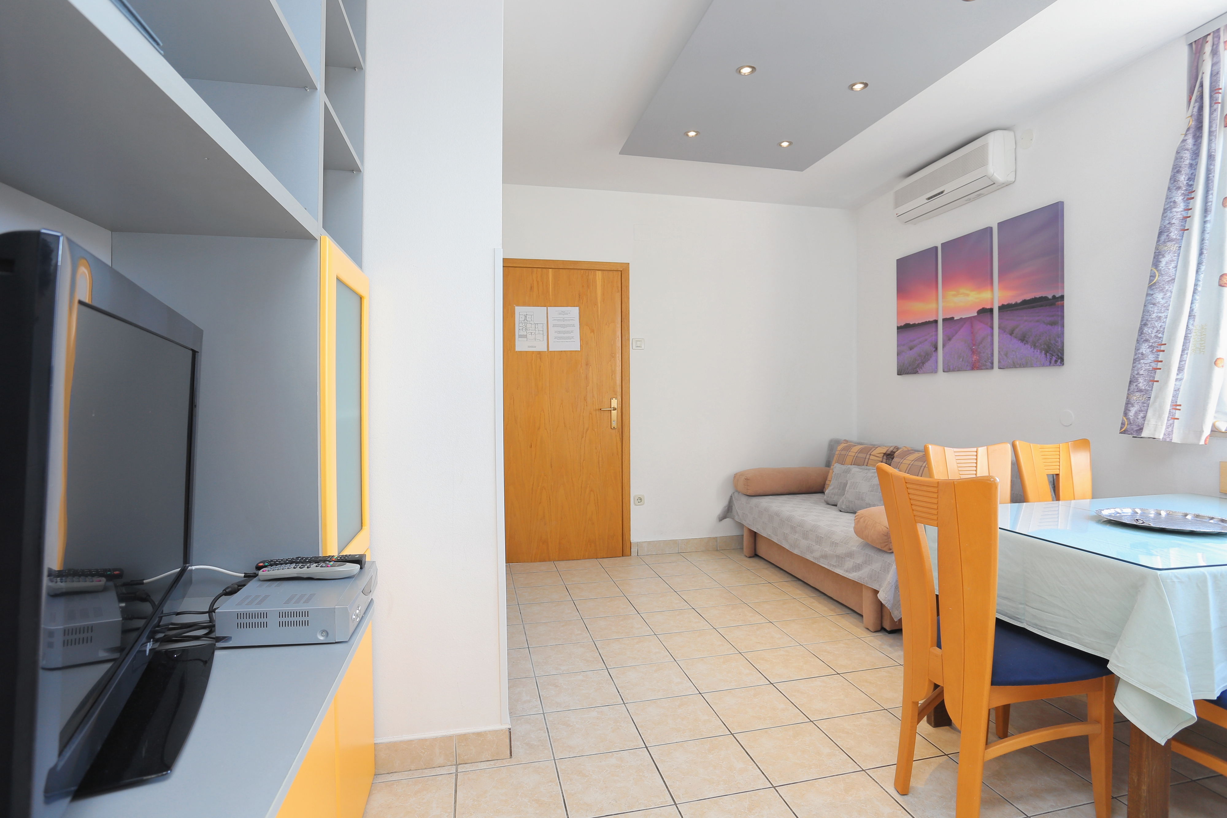 Apartment can accommodate 6 guests. Beds are situated in 2 sleeping rooms, within 54m2. Guests can use a private terrace to enjoy the warm summer evenings. Food can be prepared using barbecue which is shared with other guests too. This accommodation unit welcomes pets at an additional charge. INCLUDED IN THE PRICE: tourist tax, final cleaning, air-conditioning, parking, garage, internet, laundry, baby cot, iron, ironing board, hairdryer. OBLIGATORY ADDITIONAL COSTS: short stay fee (surcharge depending on a number of booked nights: 30% - 1, 20% - 2, 10% - 3). OPTIONAL ADDITIONAL COSTS: pets (€10.00 per night), additional bed (€10.00 per night). The availability of additional services for your chosen dates of stay, as well as their prices (if none are listed) must be checked ahead of time. Any additional services not shown in the price calculation are payable directly to the property owner and only if used by the visitor.