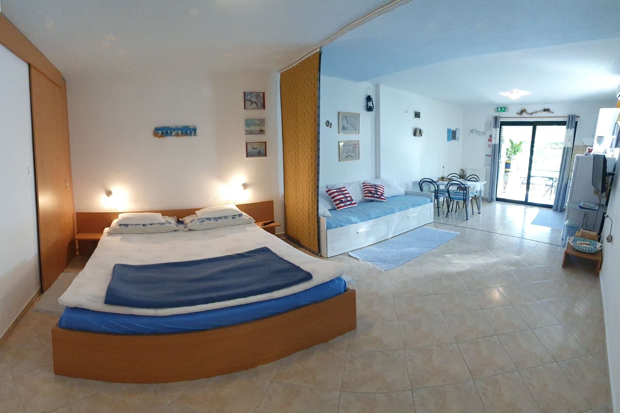Studio flat can accommodate 3 guests. Beds are situated in 1 sleeping rooms, but also in the living room, within 40m2. Guests can use a private terrace to enjoy the warm summer evenings. The studio offers the sea view. Food can be prepared using barbecue which is shared with other guests too. INCLUDED IN THE PRICE: tourist tax, final cleaning, air-conditioning, parking, internet, baby cot, iron, ironing board, hairdryer, sunshade. OBLIGATORY ADDITIONAL COSTS: short stay fee (surcharge depending on a number of booked nights: 30% - 1, 20% - 2, 10% - 3). The availability of additional services for your chosen dates of stay, as well as their prices (if none are listed) must be checked ahead of time. Any additional services not shown in the price calculation are payable directly to the property owner and only if used by the visitor.