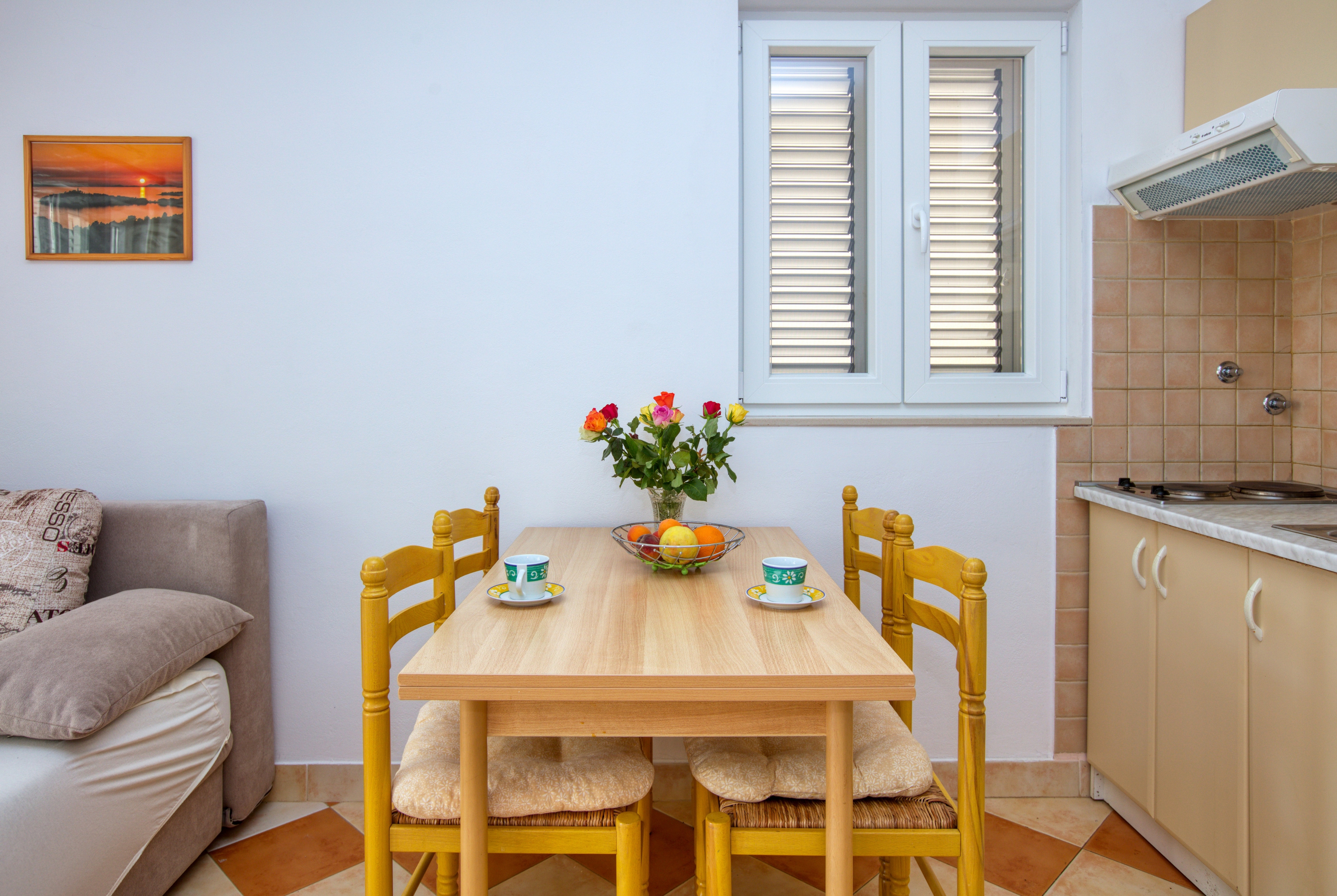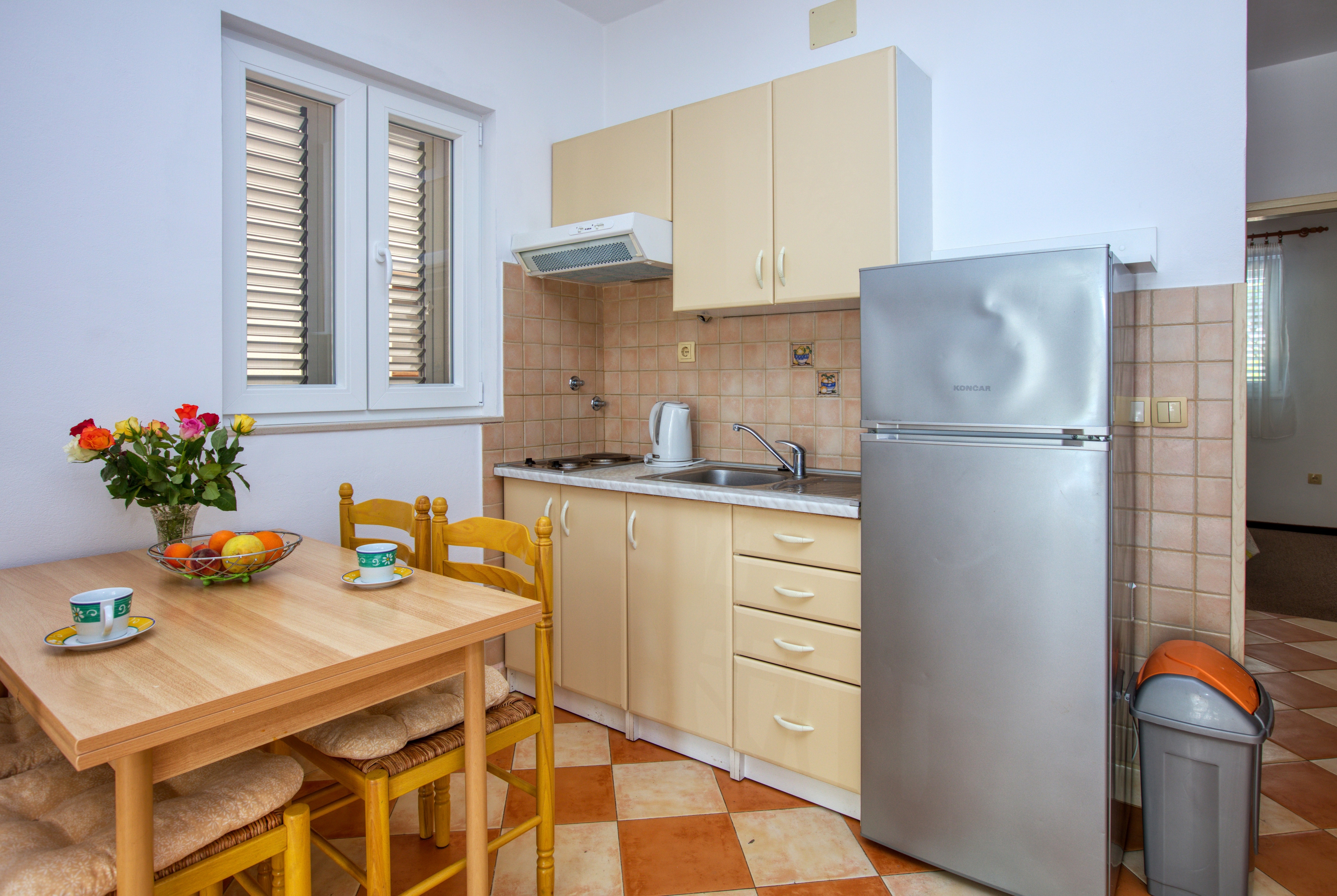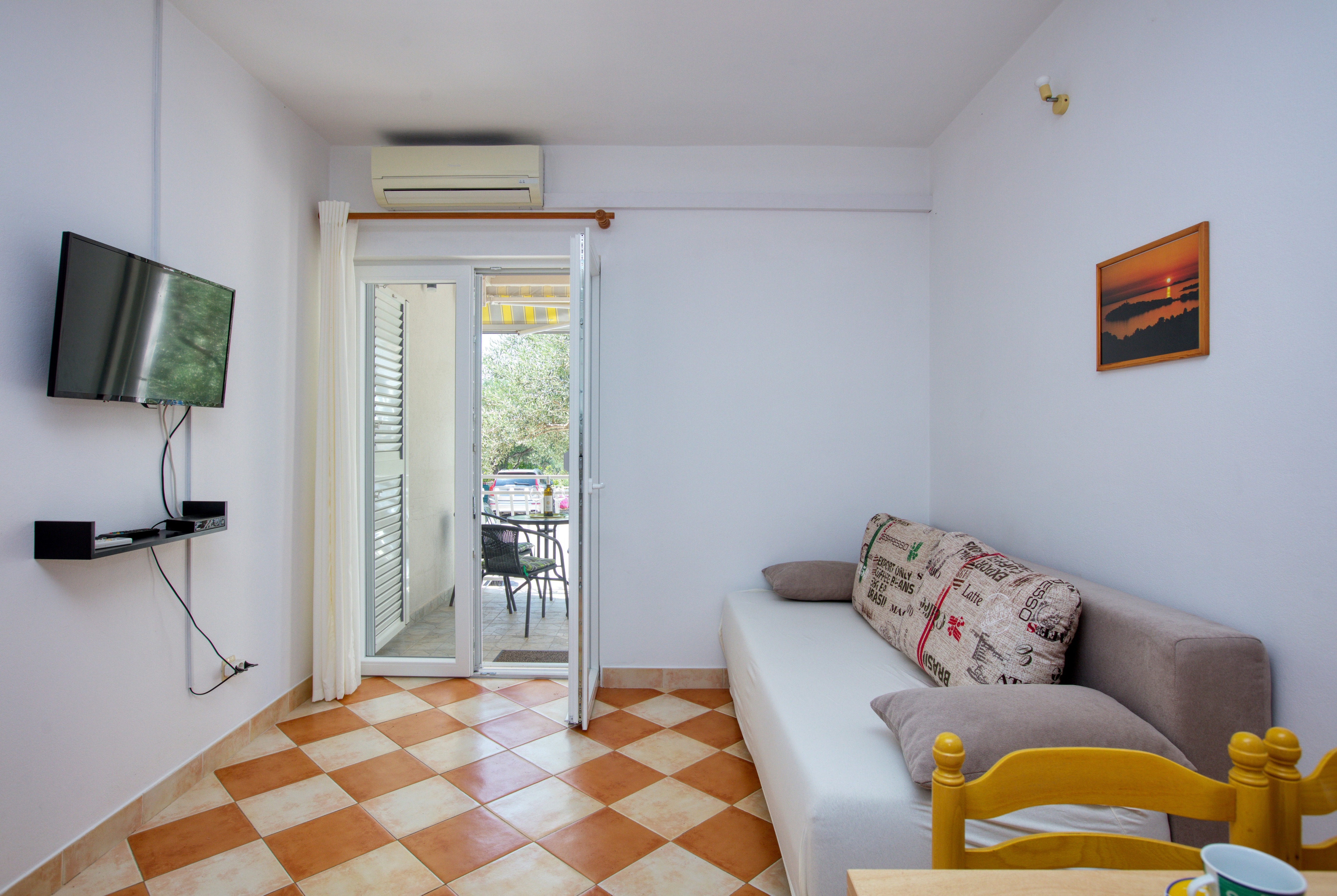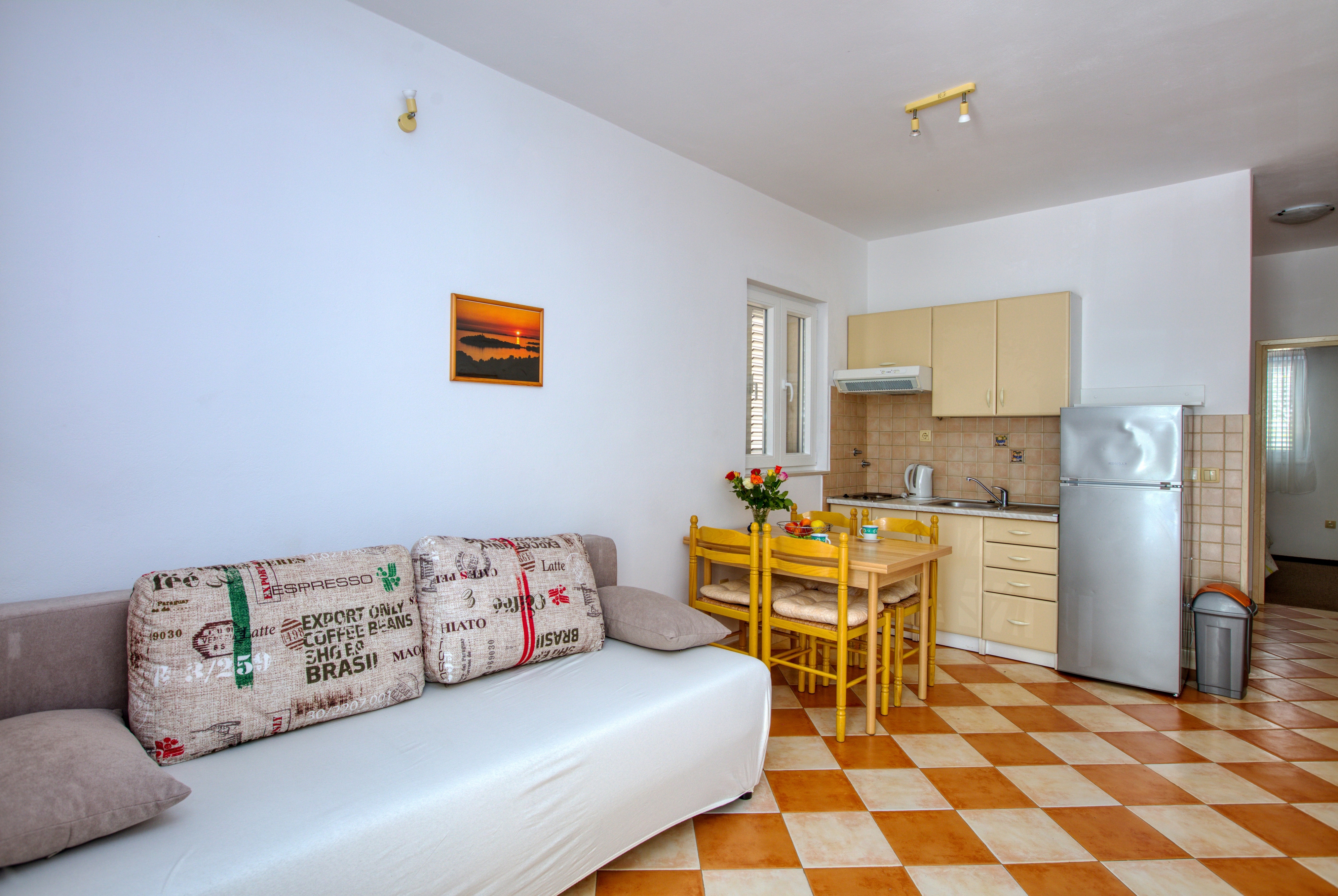 Apartment can accommodate 4 guests. Beds are situated in 1 sleeping rooms, but also in the living room, within 30m2. Guests can use a private terrace to enjoy the warm summer evenings. Food can be prepared using barbecue which is shared with other guests too. INCLUDED IN THE PRICE: tourist tax, final cleaning, air-conditioning, parking, internet, laundry, boat mooring, baby cot. The availability of additional services for your chosen dates of stay, as well as their prices (if none are listed) must be checked ahead of time. Any additional services not shown in the price calculation are payable directly to the property owner and only if used by the visitor.