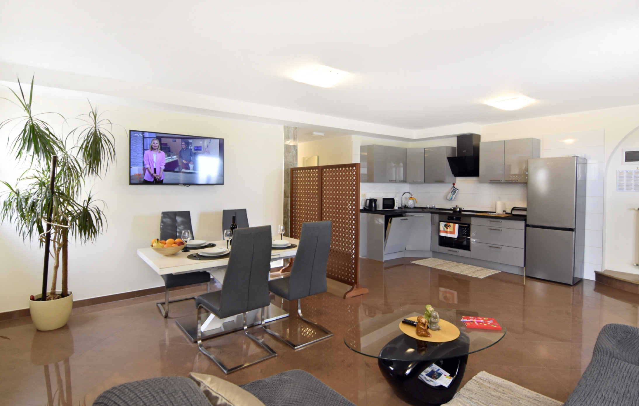 Apartment can accommodate 4 guests. Beds are situated in 1 sleeping rooms, but also in the living room, within 50m2. Guests can use a private terrace to enjoy the warm summer evenings. Food can be prepared using barbecue which is shared with other guests too. INCLUDED IN THE PRICE: tourist tax, final cleaning, air-conditioning, parking, internet. The availability of additional services for your chosen dates of stay, as well as their prices (if none are listed) must be checked ahead of time. Any additional services not shown in the price calculation are payable directly to the property owner and only if used by the visitor.