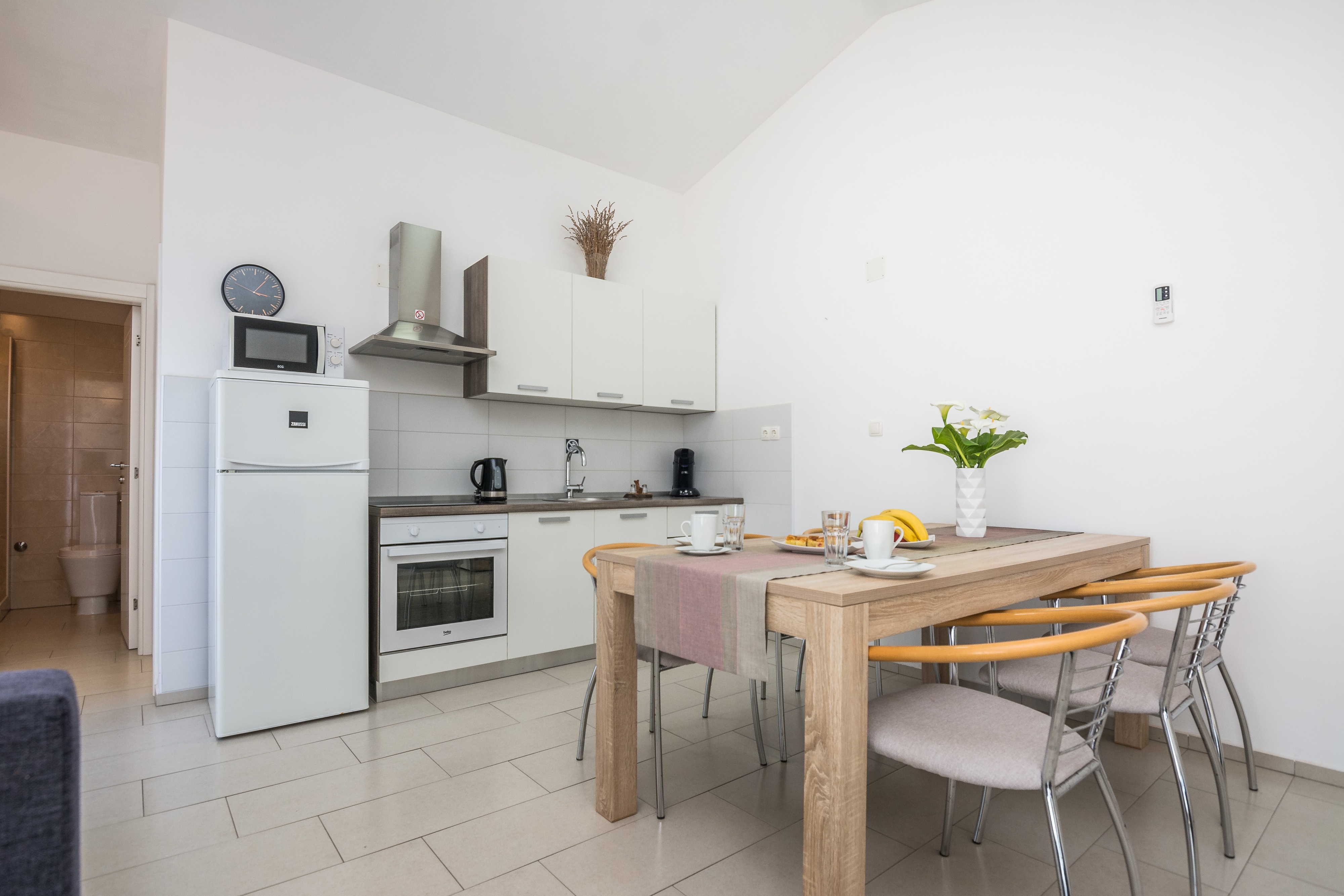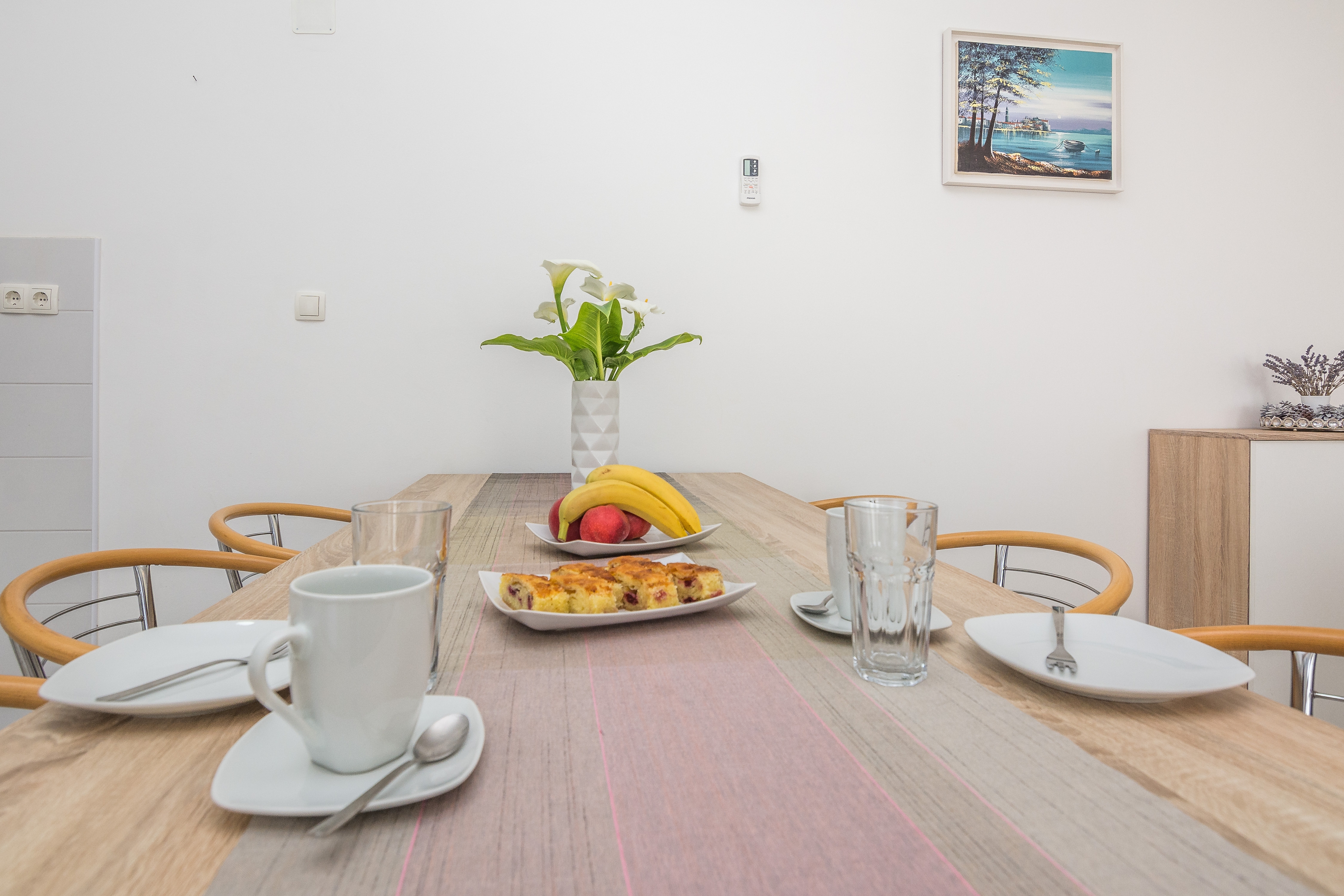 Apartment can accommodate 4 guests. Beds are situated in 1 sleeping rooms, but also in the living room, within 47m2. Guests can use a private terrace to enjoy the warm summer evenings. Food can be prepared using barbecue which is shared with other guests too. This accommodation unit welcomes pets at an additional charge. INCLUDED IN THE PRICE: tourist tax, final cleaning, air-conditioning, parking, internet, baby cot, iron, ironing board, hairdryer. OBLIGATORY ADDITIONAL COSTS: short stay fee (surcharge depending on a number of booked nights: 30% - 1, 20% - 2, 10% - 3). OPTIONAL ADDITIONAL COSTS: pets (€15.00 per night). The availability of additional services for your chosen dates of stay, as well as their prices (if none are listed) must be checked ahead of time. Any additional services not shown in the price calculation are payable directly to the property owner and only if used by the visitor.