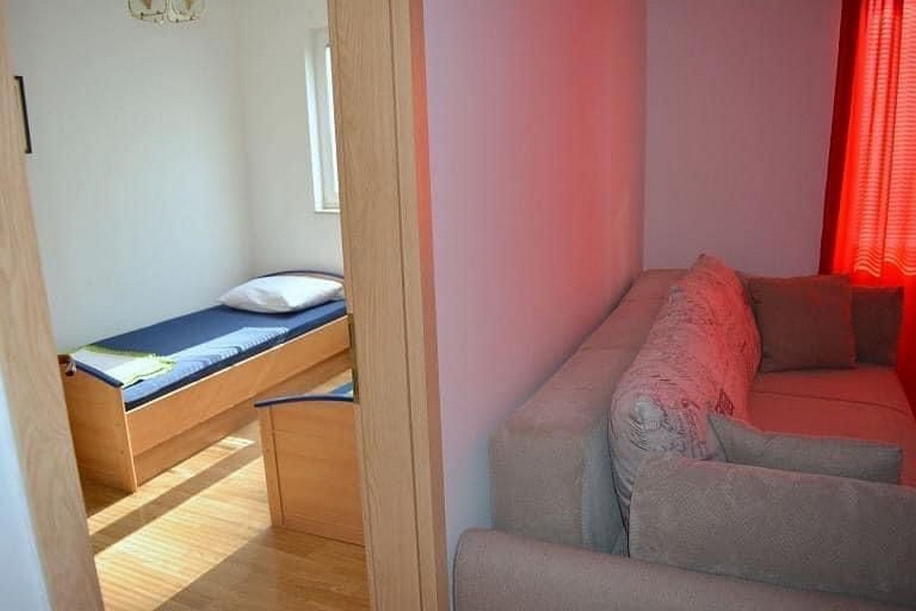 Apartment can accommodate 5 guests. Beds are situated in 2 sleeping rooms, but also in the living room, within 43m2. Guests can use a private terrace to enjoy the warm summer evenings. Food can be prepared using barbecue which is shared with other guests too. This accommodation unit welcomes pets at an additional charge. INCLUDED IN THE PRICE: tourist tax, final cleaning, air-conditioning, parking, internet, baby cot, iron, ironing board, hairdryer. OPTIONAL ADDITIONAL COSTS: laundry (€10.00 washing), pets (€10.00 per night). The availability of additional services for your chosen dates of stay, as well as their prices (if none are listed) must be checked ahead of time. Any additional services not shown in the price calculation are payable directly to the property owner and only if used by the visitor.
